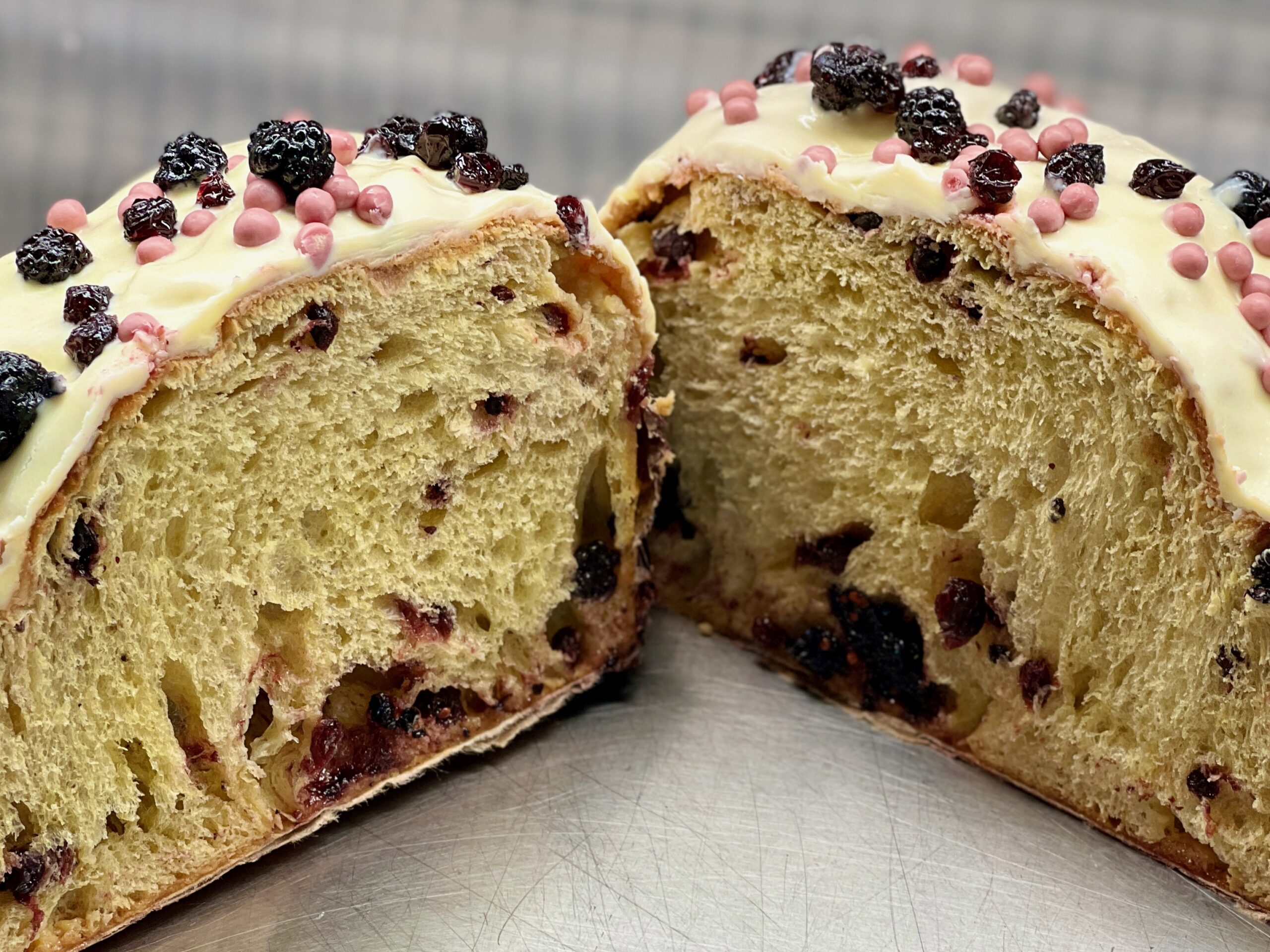 Impasto tradizionale arricchito con deliziosi frutti di bosco canditi e cioccolato bianco sia all interno che nella glassatura.