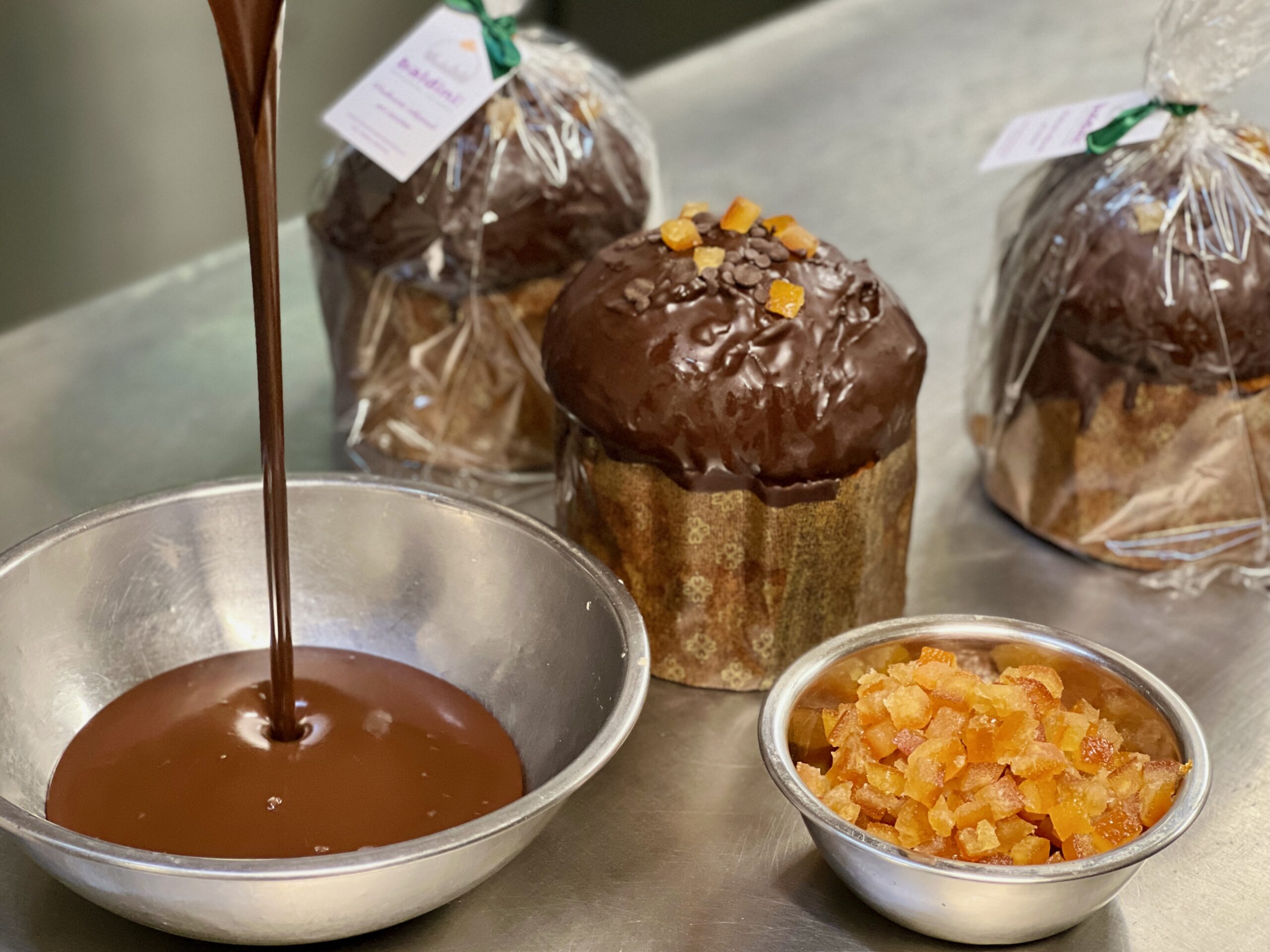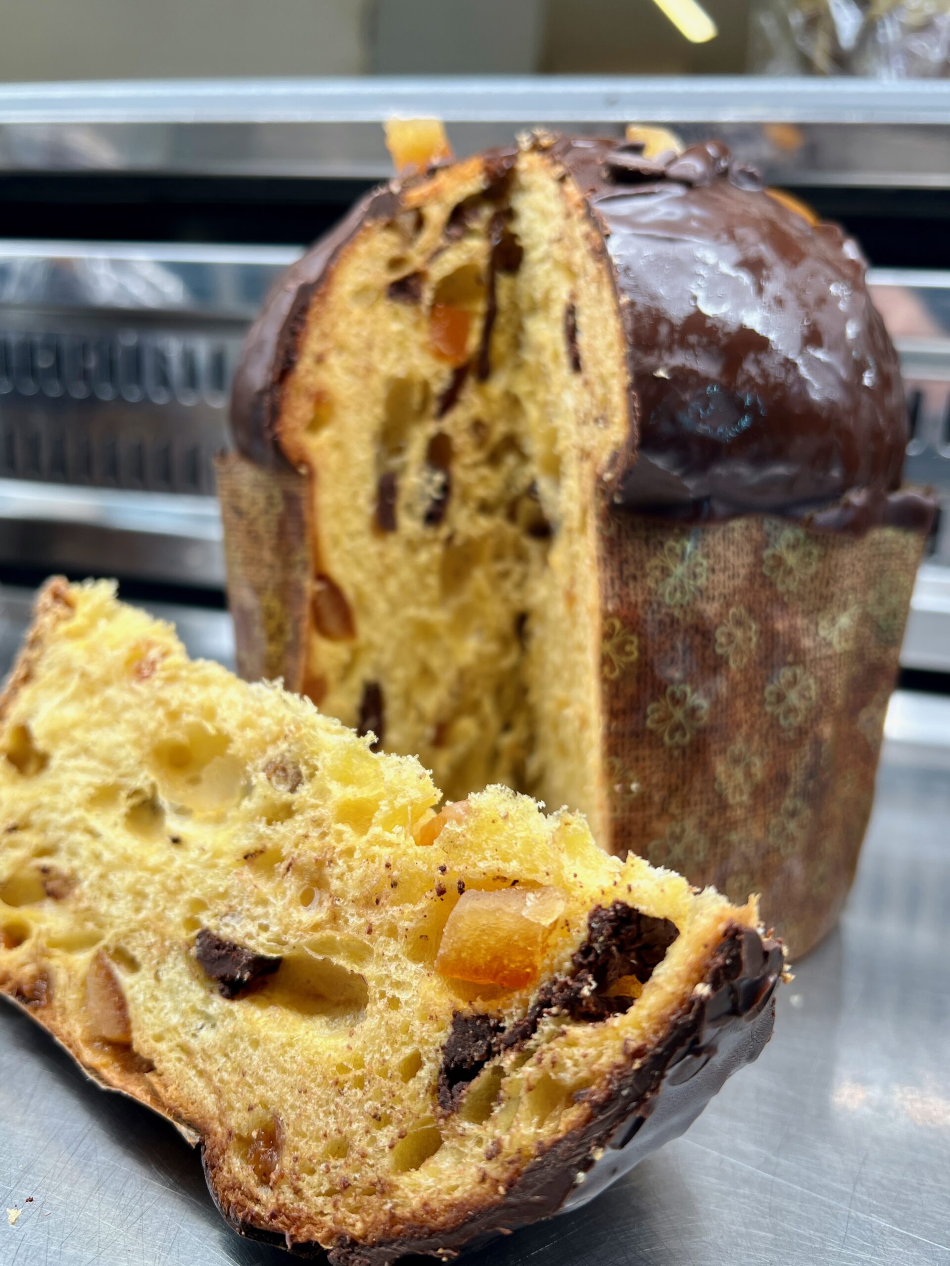 Ingredienti: farina di grano tenero tipo 00, burro, tuorli d’uovo, zucchero, miele, canditi di arancia, cioccolato fondente 70% e 50%, lievito madre, sale, vaniglia.